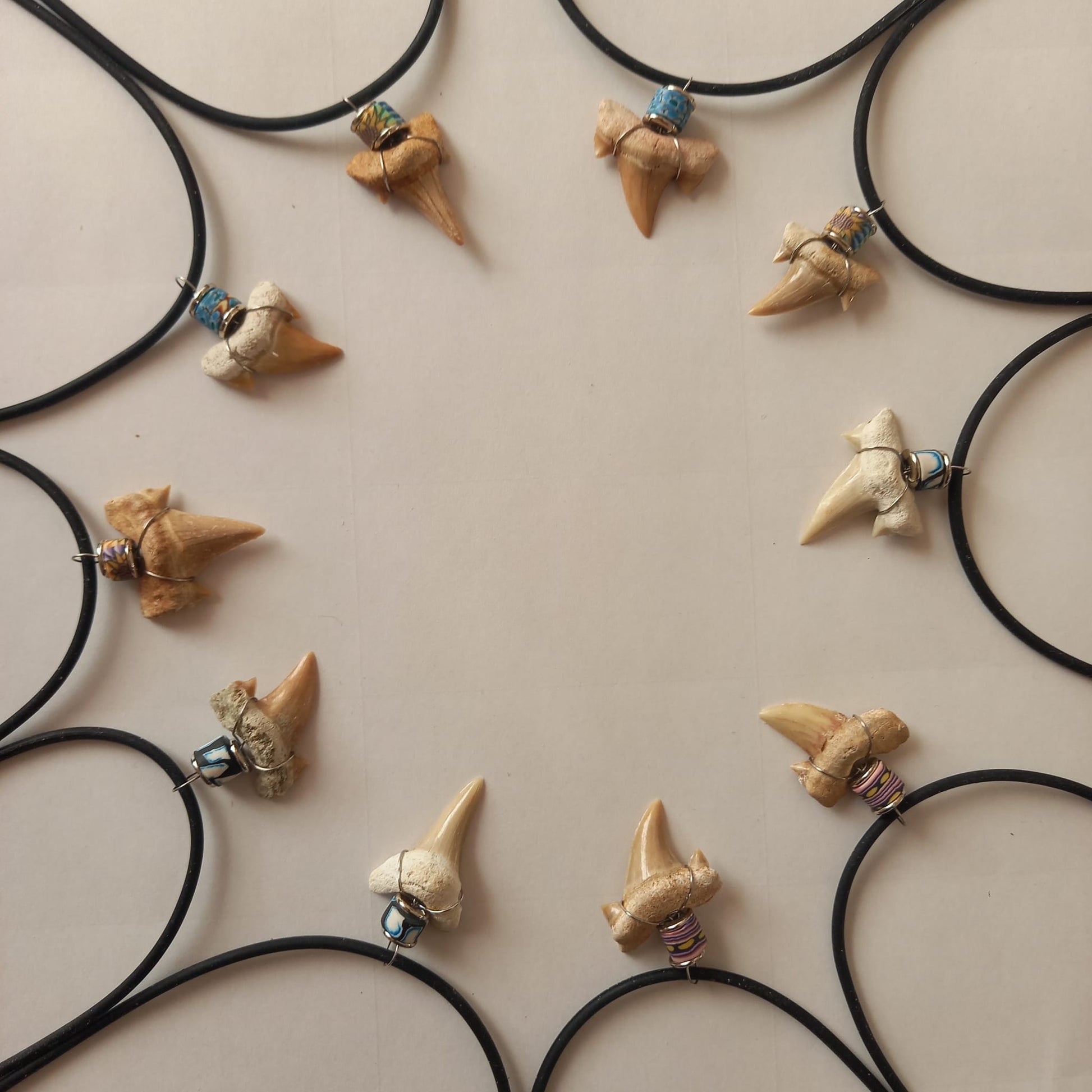 Äkta exemplar: Detta halsband har en riktig, fossiliserad hajtand av typen Otodus obliquus , uppskattad till 60–100 miljoner år gammal , som kommer från Marocko.